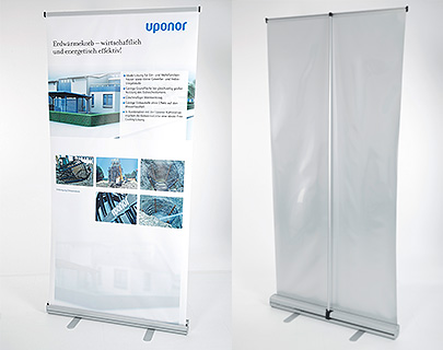 Uponor stattet seine Vertreter mit Rollups aus. So sind diese überall für Präsentationen gerüstet – die platzsparenden Rollups liegen stets im Kofferraum und sind in wenigen Sekunden einsatzbereit.