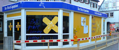 Hirschapotheke Öhringen · Übergangs-Container · Digitaldruck + Systemtextfolien