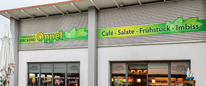 Bäckerei Oppel · Filiale Trosdorf · Glasdekor (Logo negativ geplottet) · Schilder (Aluverbund 4 mm) · Digitaldruck